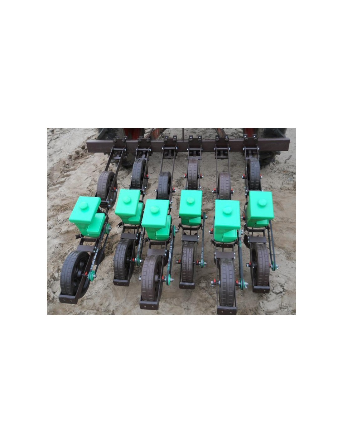 A mellékelt képeken hatsoros változat látható - 20 cm-es sortávra zöldség mag vetéséhez kialakítva. Látható, hogy 3 elem rövidebb 3 pedig hosszabb karral csatlakozik a gerendához, így a vetőelemek eltolásával oldható meg a sortávolság minimum 18-20 cm-re való beállítása.