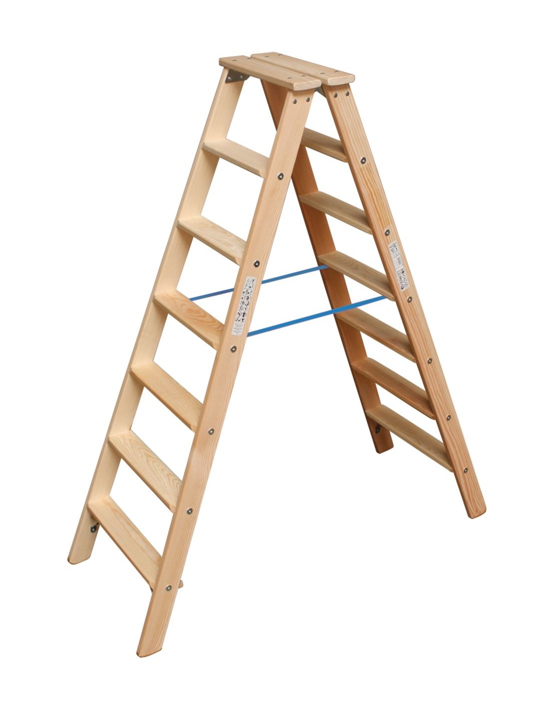 Lépcsőfokos két oldalon járható fa létra. A kényelmes, két oldalon járható fa létra mély lépcsőfokokkal kényelmes állást biztosít. Ideális festők és villanyszerelők számára.