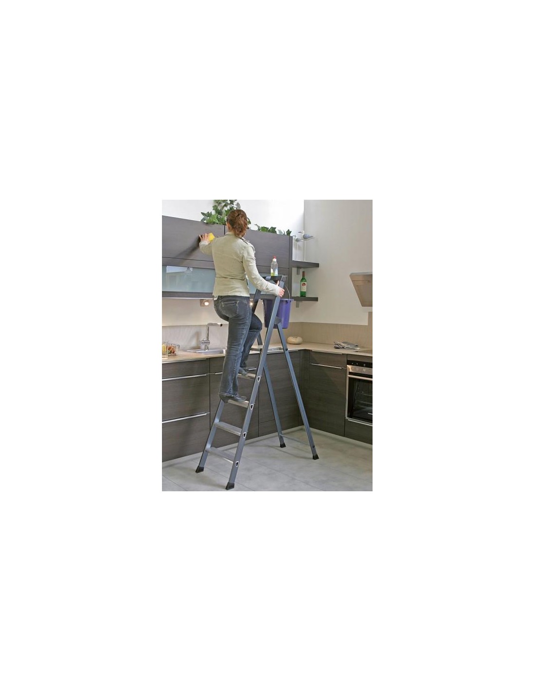 Ennél az alumínium állólétránál a peremezett fokok és az eloxált szárak révén a hosszú élettartam és a tisztaság áll a középpontban.