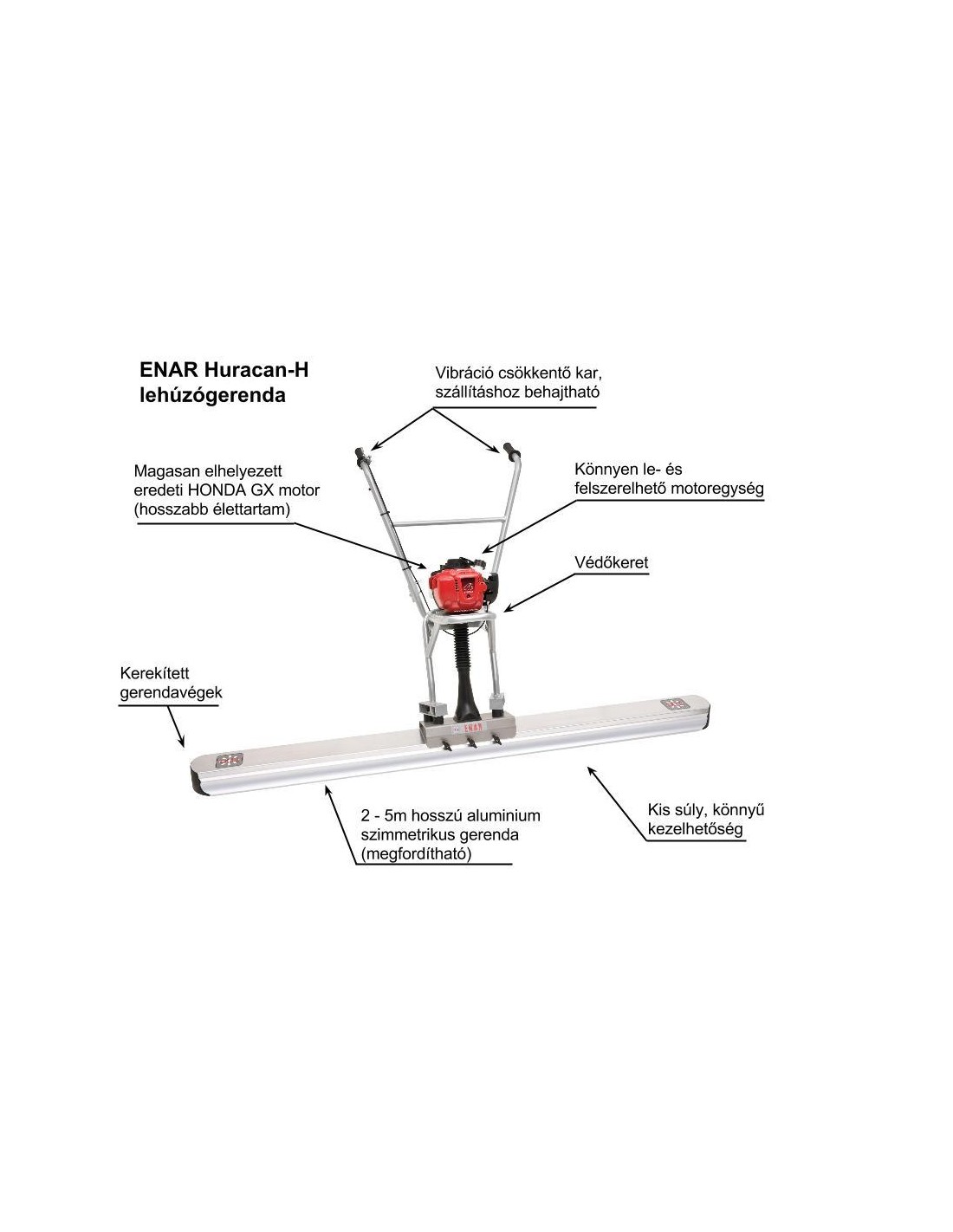Megfelelő szintű és tartós betonfelület létrehozásához a felületet ENAR HURACAN-H vibrációs lehúzógerendával kell lehúzni és tömöríteni. A vibráció a beton konzisztenciájától, a gerenda hosszától és a motor teljesítményétől függően 50 - 150 mm mélységig hat.