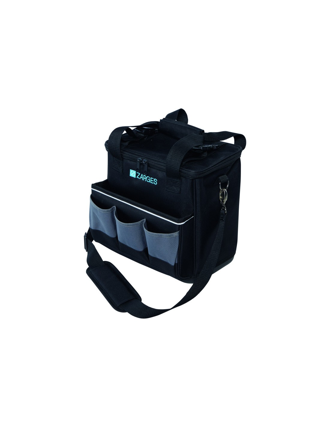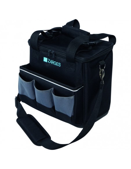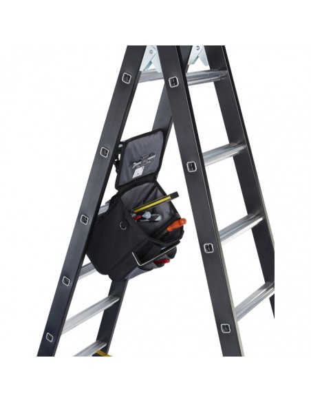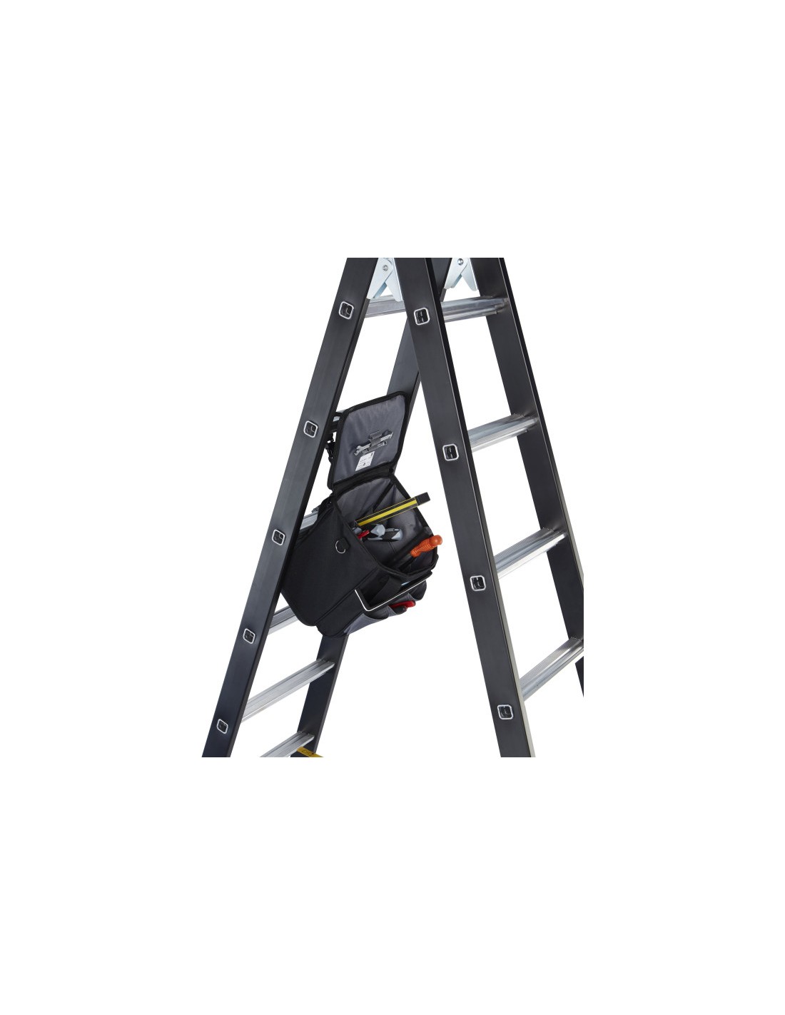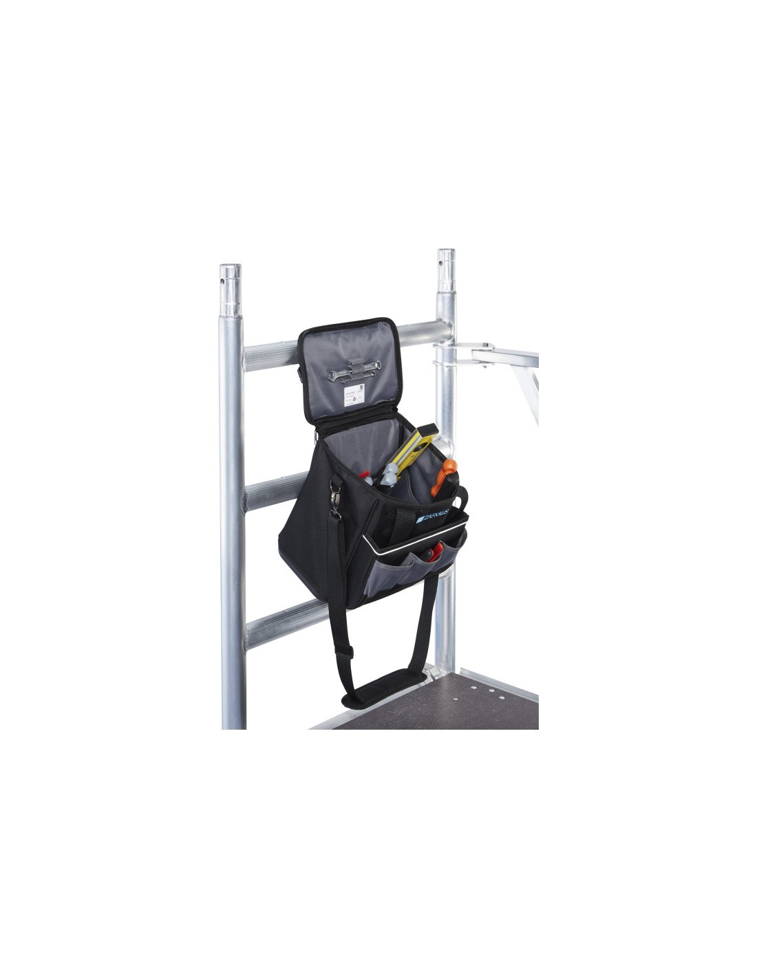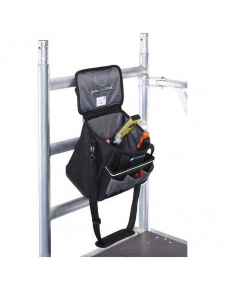 Szerszámtáska műanyag aljjal és megerősített hátoldallal. Rögzítés a korlátra kapcsos zárral. Maximális terhelhetőség 15 kg.