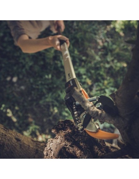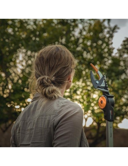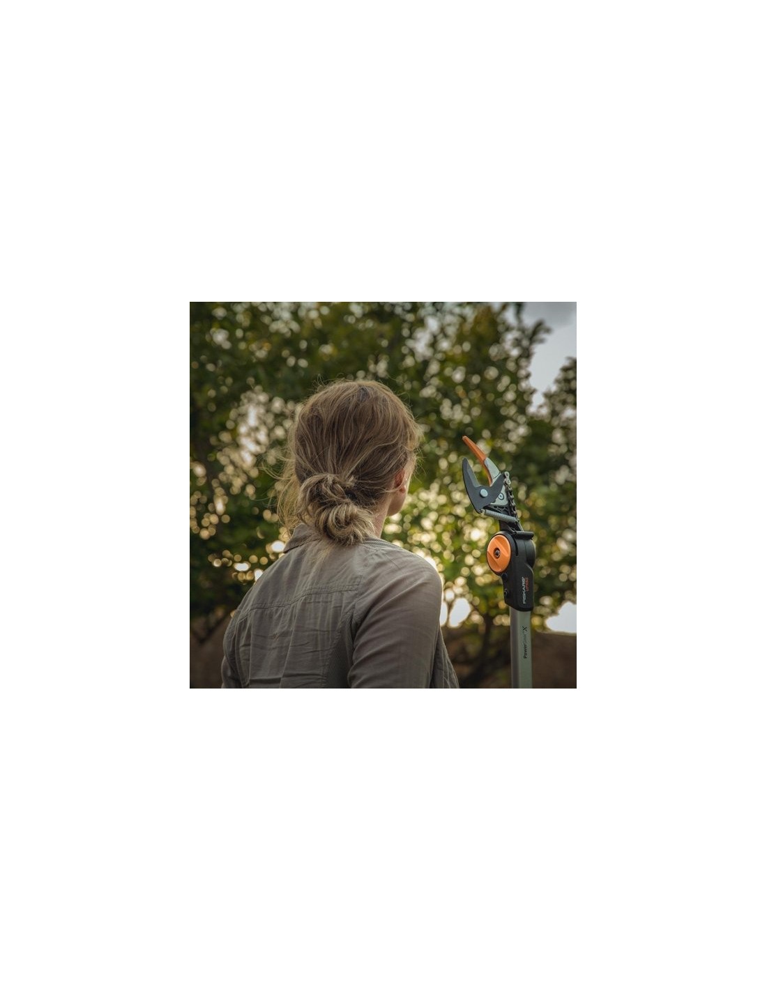 A Fiskars PowerGear™ X Tree Pruner (UPX82) zseniális, teljesítménynövelő mechanizmussal rendelkezik, képes akár Ø 32 mm átmérőjű friss fa vágására, 3,5 méteres kinyúlással. Tapasztalja meg a könnyebb vágásokat a PowerGear™ X technológiával, amely könnyed és pontos metszést tesz lehetővé létra, hajolgatás vagy megerőltetés nélkül. A PowerGear X™ favágók narancssárga vágástámasztékkal rendelkeznek a jobb láthatóság érdekében és 230°-ig állítható vágási szöget biztosítanak. A tartós, kiváló minőségű acél pengék súrlódáscsökkentő PTFE-bevonattal rendelkeznek, amely hosszabb ideig tart, még erős igénybevétel mellett is. A tengely könnyű, időjárásálló alumíniumból készült, ergonomikus SoftGrip™ fogantyúval a kényelem, az irányítás és a csúszásmentes tartás érdekében. Cserefogantyú és kötélkészlet vagy vágófej igény szerint elérhető. Fedezzen fel további kompatibilis alkatrészeket, például a többfunkciós ágfűrészt és a gyümölcsszedőt.
