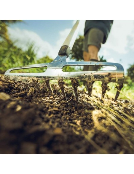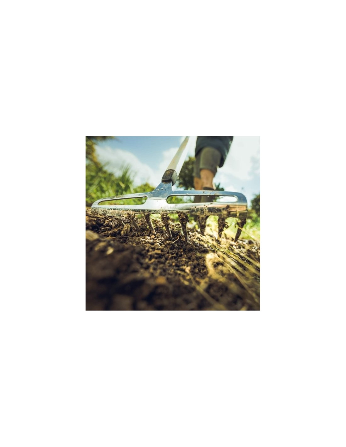 Hihetetlenül tartós rozsdamentes acél fej, 10 foggal a keskenyebb területekhez; ideális a szűk ágyásokban történő gereblyézéshez, talajigazításhoz
