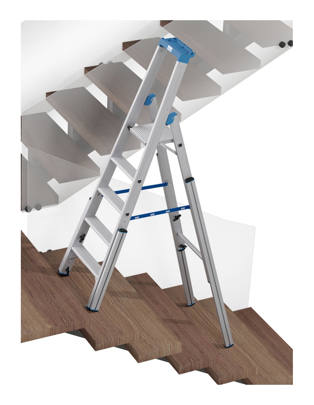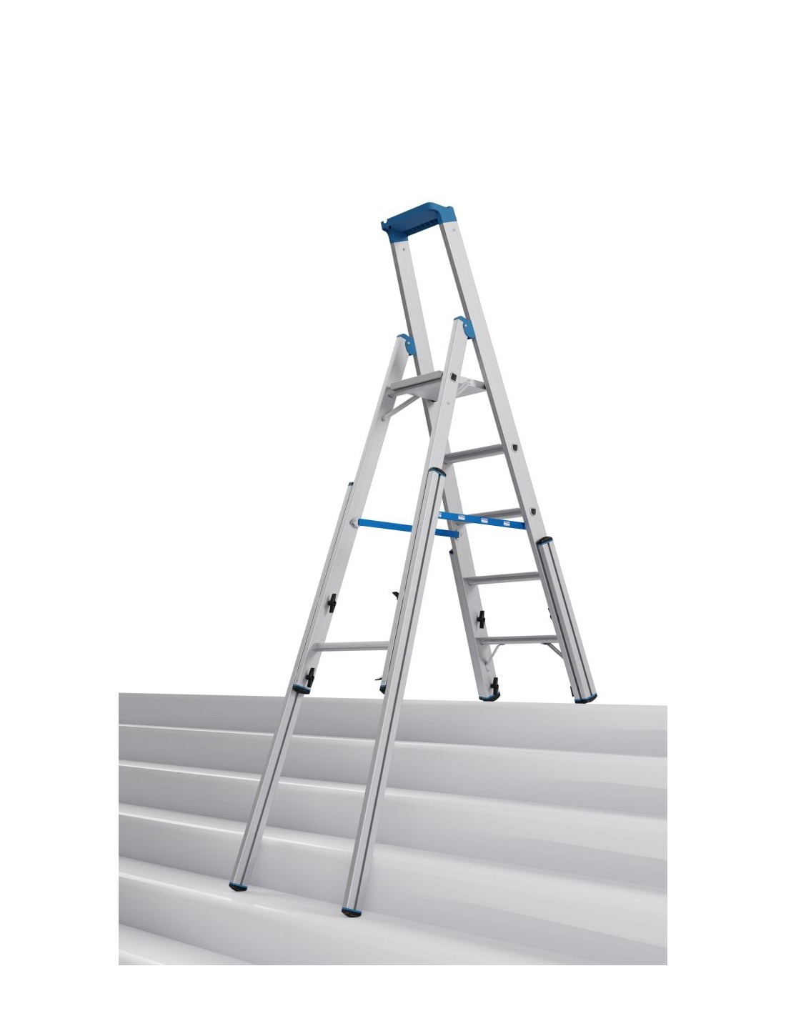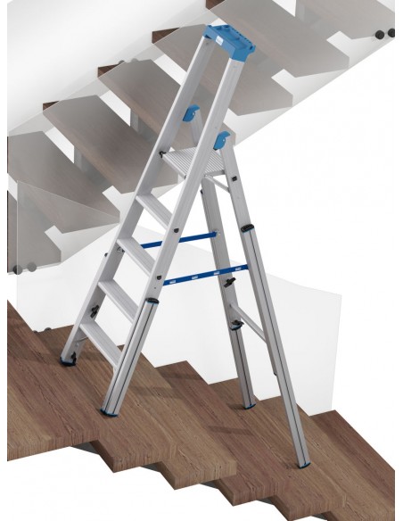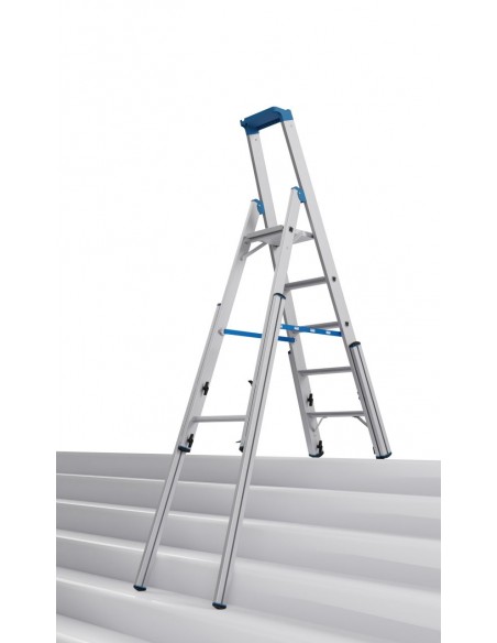 Robusztus, egy oldalon járható alumínium teleszkópos létra 4 szárhosszabbítóval professzionális használatra lépcsőkön, sarkokban, emelvényeken és hasonló magasságkülönbségek esetén.