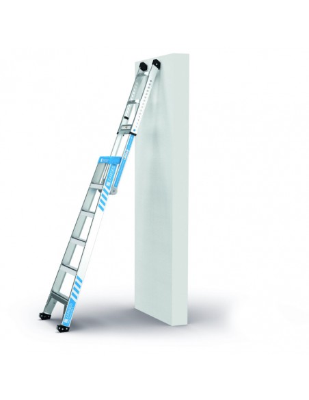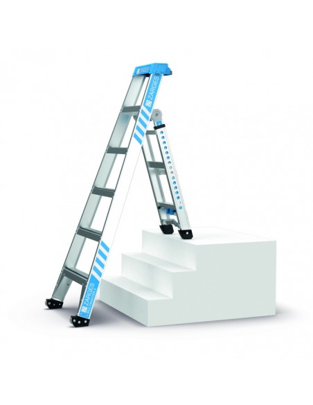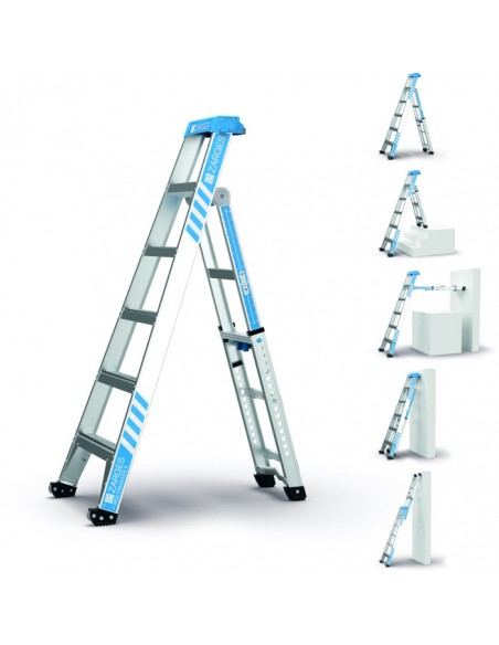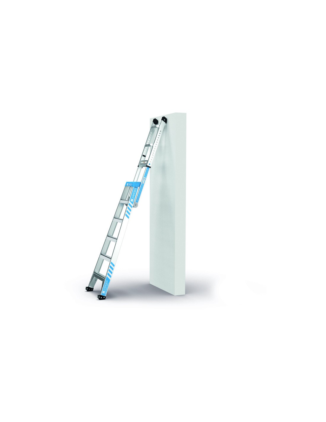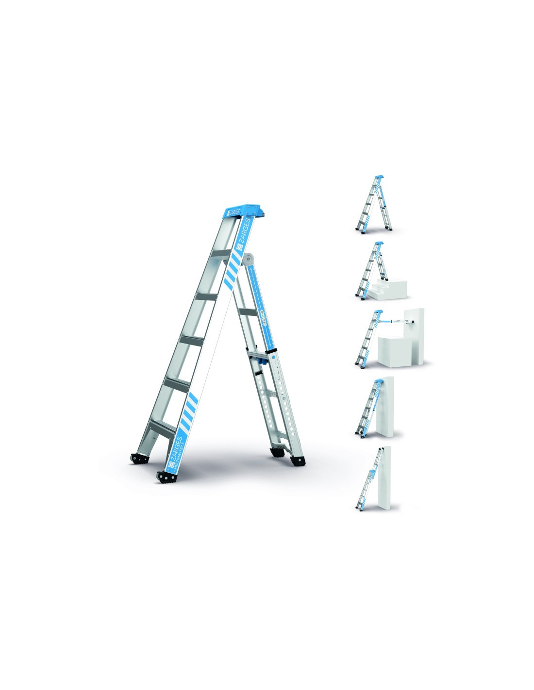 Egy létra, 5 különböző felhasználási mód Állólétra, lépcsőn felállítható állólétra, támasztólétra eltolt állapotban, támasztólétra, valamint kitolt támasztólétra egy termékben.