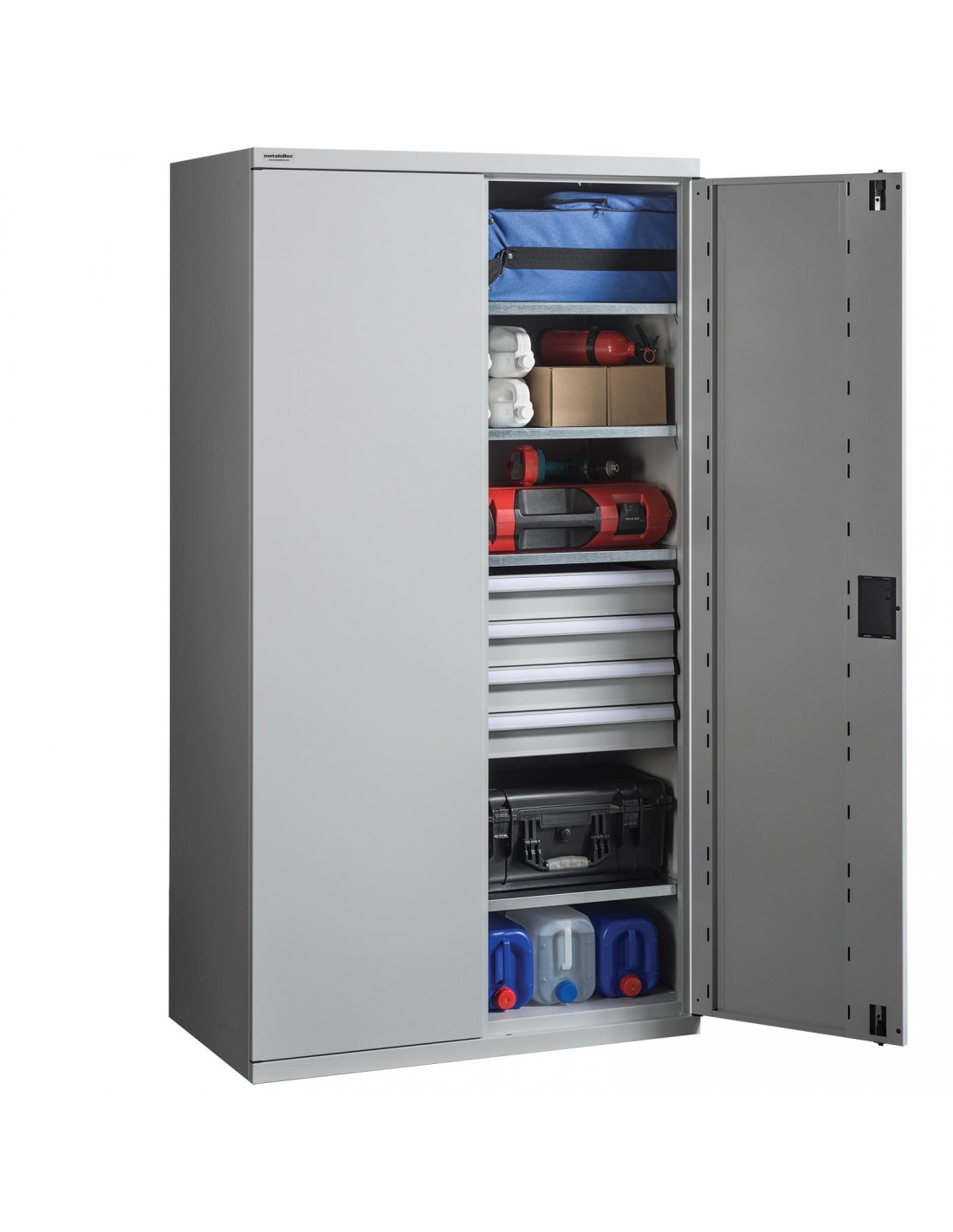 Könnyen gördülő, jól terhelhető fiókjai az apróbb eszközök rendezett tárolására kínálnak megoldást, míg a 100 kg-ig terhelhető polcokon a nagyobb szerszámok, alkatrészek biztonságos tárolására van lehetőség.
